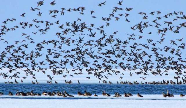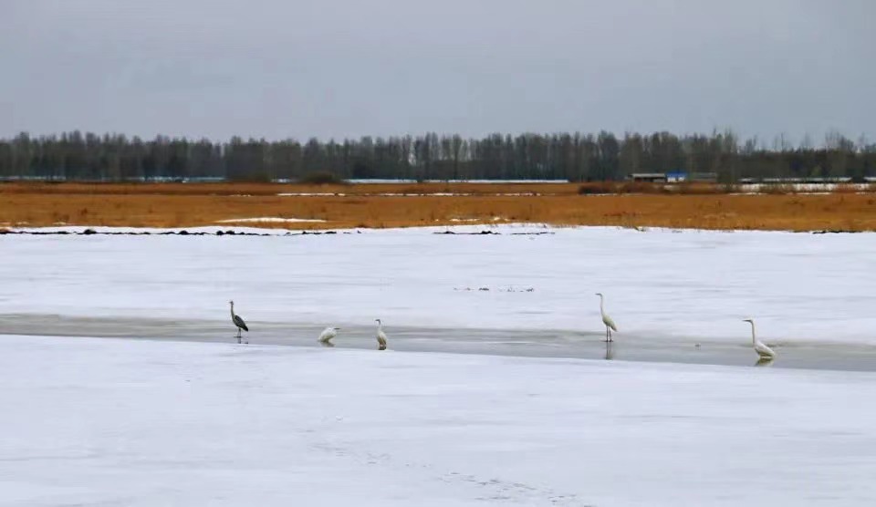 在雁窩島國家級生態(tài)濕地自然保護(hù)區(qū)內(nèi)的冰面上,白鸛、灰鸛還有小水雞,三五一組,有的悠閑散步,有的仰頭眺望,有的在融化的雪水中覓食,還有的在低空盤旋。比往年提前10天到來的候鳥,為雁窩島增添了初春的氣息和生機(jī)。