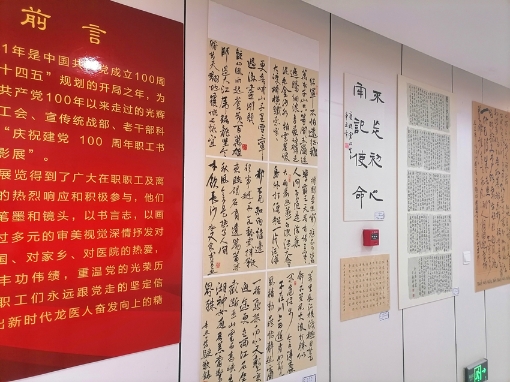 據(jù)了解,此次活動(dòng)共入展攝影作品41幅、書法作品15幅、繪畫作品13幅、手工制作5件、詩歌2首及微視頻4部,其中部分作品在該院門診五樓進(jìn)行了展示。攝影作品《守護(hù)》,作者是省醫(yī)院兒科副主任汪琪,通過鏡頭展現(xiàn)了醫(yī)務(wù)工作者的日常忙碌,及不知疲倦、一絲不茍的內(nèi)心世界;書法作品《紅船精神》,作者是省醫(yī)院南崗院區(qū)泌尿外一科主任楚寧,筆法嫻熟、清秀雋永,字里行間體現(xiàn)出堅(jiān)定理想、百折不撓的奮斗精神;書法作品《不忘初心》聯(lián)句,作者是省醫(yī)院南崗院區(qū)普外科姜峰奇,古樸自然,一顆紅心永向黨;繪畫作品《一唱雄雞天下白》,作者是省醫(yī)院退休老干部張克起,作品直接用畫面抒發(fā)革命浪漫主義情懷;繪畫作品《江山多嬌》,作者是省醫(yī)院退休老職工賈雨虹,用嬌美的花朵為黨的百年華誕獻(xiàn)禮。