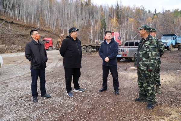 圖為阿木爾林業(yè)局黨委副書記、局長韓鳳泉(右二)深入到2—1線檢查新開通路線施工進展情況(王力/攝)