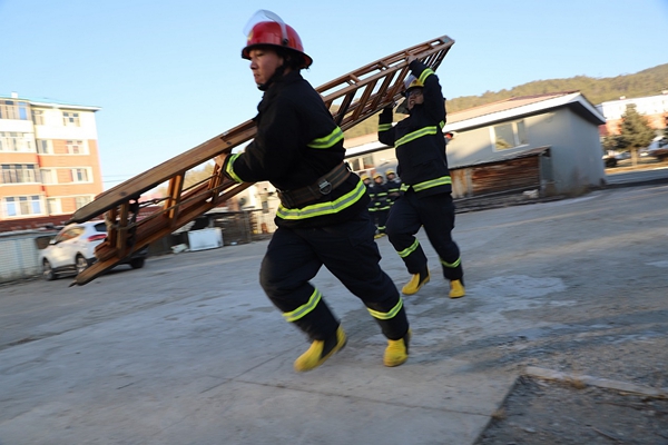 阿木爾公安城鎮(zhèn)消防大隊(duì)?wèi)?zhàn)斗員演練二節(jié)拉梯科目(王力/攝)