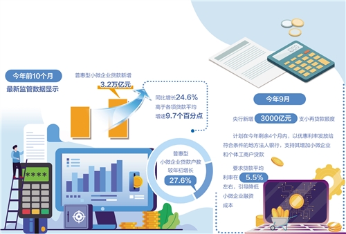 最新監(jiān)管數(shù)據(jù)顯示,今年前10個(gè)月,普惠型小微企業(yè)貸款新增3.2萬億元,同比增長(zhǎng)24.6%,高于各項(xiàng)貸款平均增速9.7個(gè)百分點(diǎn);普惠型小微企業(yè)貸款戶數(shù)較年初增長(zhǎng)27.6%。