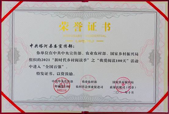 塔河縣委宣傳部在2020、2021連續(xù)兩年榮獲“新時代鄉(xiāng)村閱讀季”全國百強榮譽稱號,