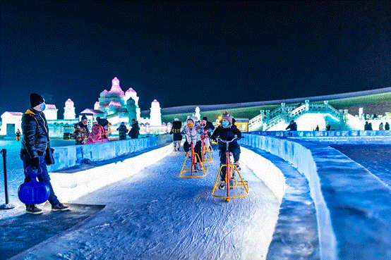 今年園區(qū)的另一個(gè)“人氣王”,非單車(chē)城堡莫屬。單車(chē)城堡內(nèi)的冰上自行車(chē)項(xiàng)目,每天都吸引著大量游客騎行體驗(yàn)。在冰面上掌控方向不是件容易事,騎著冰上自行車(chē),穿行于美麗的冰城堡中,對(duì)游客來(lái)說(shuō)是一種前所未有的奇妙體驗(yàn)。