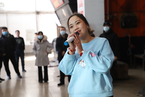 阿木爾林業(yè)局文藝輕騎兵小分隊(duì)隊(duì)員張春雨為物業(yè)公司集中供熱一車間司爐工演唱歌曲《又見(jiàn)山里紅》(王力 攝)
