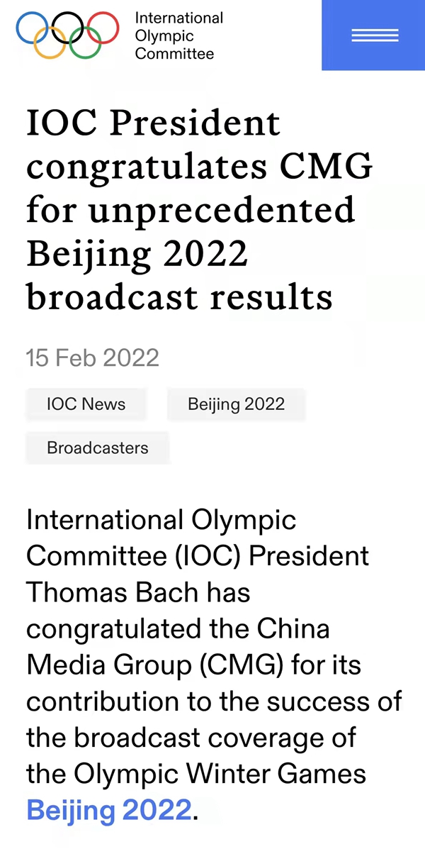 據(jù)國際奧委會(huì)官方網(wǎng)站2月15日消息:國際奧委會(huì)主席托馬斯·巴赫對中央廣播電視總臺(tái)為成功轉(zhuǎn)播報(bào)道2022年北京冬奧會(huì)所做出的貢獻(xiàn)表示祝賀。