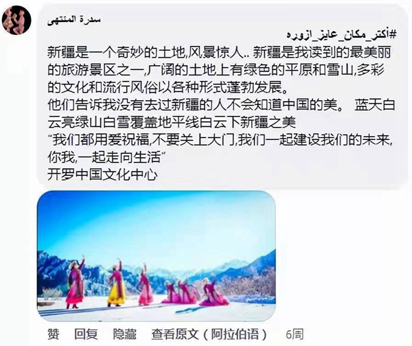 其中,來自埃及曼蘇拉的西德拉·蒙塔哈獲得本次活動的“最佳評論獎”。她在中心帖文下多次留言,“新疆風景迷人,是最美的旅游勝地之一。在廣袤的土地上有草原和雪山,沒有去過新疆的人,就不會知道中國的美……我想去那里滑雪、騎馬?!绷硗?,她還想去北京吃炸醬面,去遼寧泡溫泉等。