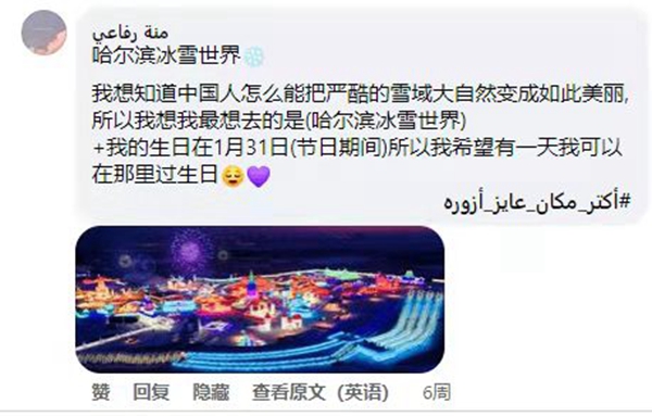 開羅中國文化中心臉書主頁超級粉絲艾曼·索比、曼娜·伊薩姆和羅飛三位網友獲得了優(yōu)秀評論獎。艾曼·索比在留言中提出想去黑龍江大慶泡雪地溫泉;曼娜·伊薩姆在評論里說她想去哈爾濱極地公園游玩,想去牡丹江鏡泊湖的冰瀑跳水,想去吉林的查干湖看看;羅飛表示想到哈爾濱冰雪大世界去過生日。眾多網友也紛紛曬出了自己最想去的地方,新聞與媒體從業(yè)者加達·阿里想先去遼寧的滑雪場,然后再去采摘丹東的草莓;來自明亞省的緒瑪·穆斯塔法表示想去內蒙古東方冰雪小城阿爾山旅游;畢業(yè)于蘇哈格大學的薩蒙·瓦赫想去北京看奧林匹克塔等。網友們各抒己見,暢想去中國的夢幻旅程。