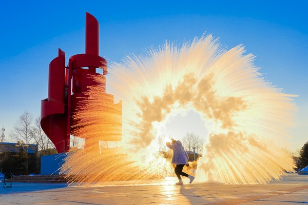 游客在大興安嶺體驗(yàn)潑水成冰