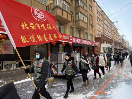 在北安,一走進(jìn)北安步行街,首先映入眼簾的是身著迷彩馬甲的退役軍人志愿者們,向沒(méi)佩戴口罩的市民免費(fèi)發(fā)放口罩,并主動(dòng)宣傳疫情防控知識(shí);頂著寒風(fēng),將步行街內(nèi)的積雪清理干凈,方便了市民的通行;幫助社區(qū)居民正確分類(lèi)處置各類(lèi)生活垃圾。這是北安市退役軍人服務(wù)中心、“橄欖綠”退役軍人志愿者服務(wù)隊(duì)正在踐行著幸福北安,文明有我。