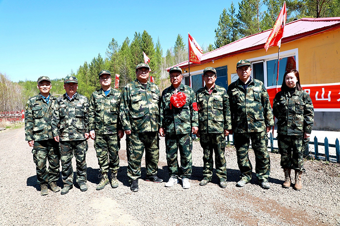 阿木爾林業(yè)局、依東林場(chǎng)領(lǐng)導(dǎo)干部與即將退休的共產(chǎn)黨員、管護(hù)員滿德江合影。(王力 攝)