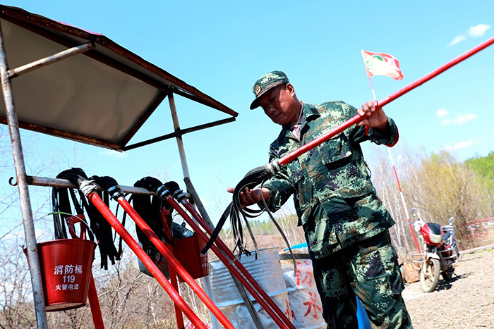共產(chǎn)黨員、管護(hù)員滿德江帶著依依不舍,再次整理、擺放撲火工具。(王力 攝)