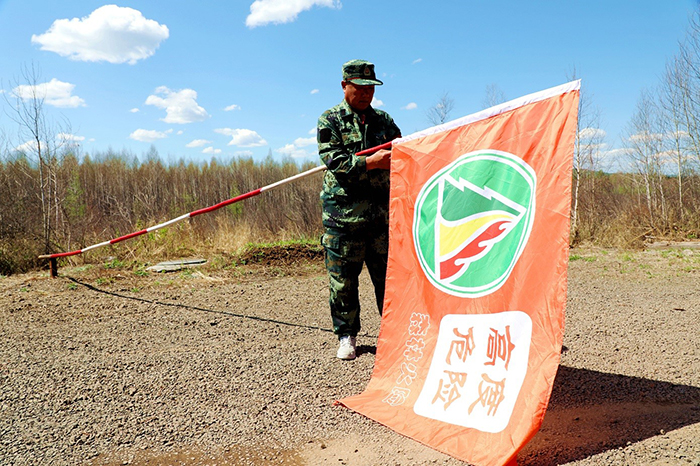 共產(chǎn)黨員、管護(hù)員滿德江站好最后一班崗,準(zhǔn)備升防火預(yù)警旗。(王力 攝)
