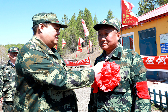 阿木爾林業(yè)局黨委書記胡守慶(左)為依東林場(chǎng)即將退休的共產(chǎn)黨員、管護(hù)員滿德江(右)戴上“光榮花”。(王力 攝)
