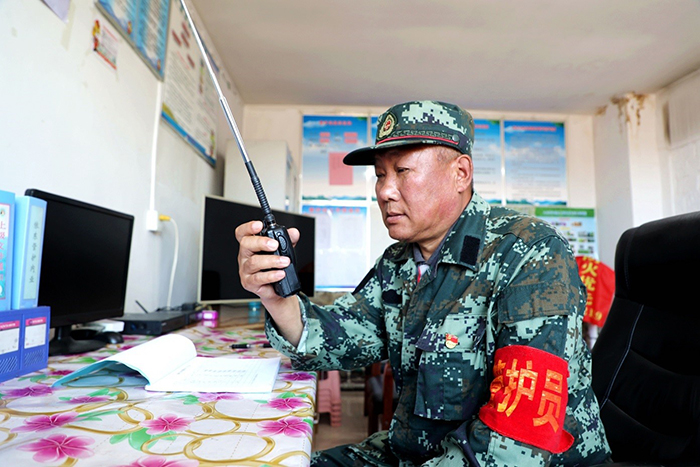 共產(chǎn)黨員、管護(hù)員滿德江在向阿防指匯報(bào)工作情況。(王力 攝)