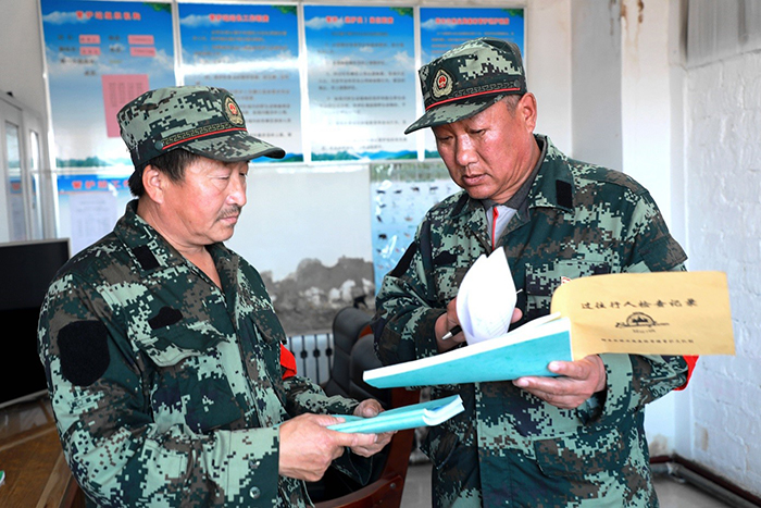 共產(chǎn)黨員、管護(hù)員滿德江叮囑“戰(zhàn)友”張振東把記錄本記好。(王力 攝)