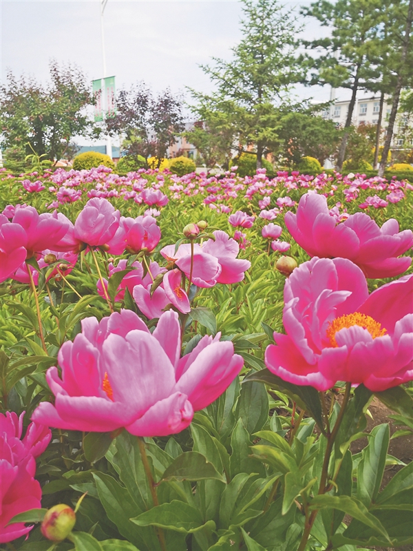沿著公路,中藥材種植基地呈現(xiàn)一片花海:大片芍藥已經(jīng)開花,白的粉的隨風(fēng)飄搖;千畝黃芩都已經(jīng)3歲,仿佛綠蘿緞一直蔓延到遠(yuǎn)方的山坡;萬畝沙棘谷,更像一幅水墨畫,剛露頭的沙棘果盡顯萌態(tài);樹下間作的蒲公英盛開著黃色的小花;紫的泛黑的藍(lán)靛果吸引一群群鳥兒不停來啄食……