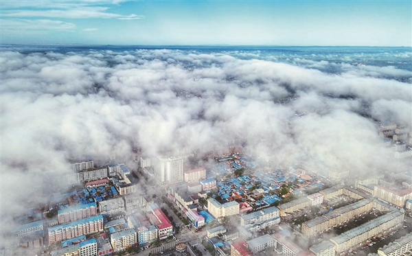 7日,雨后的龍江縣出現(xiàn)平流云景觀。清晨,大面積平流云從龍江縣龍江鎮(zhèn)上空飄過,潔凈的街路、青翠的田野掩映其間,若隱若現(xiàn),蔚為壯觀。