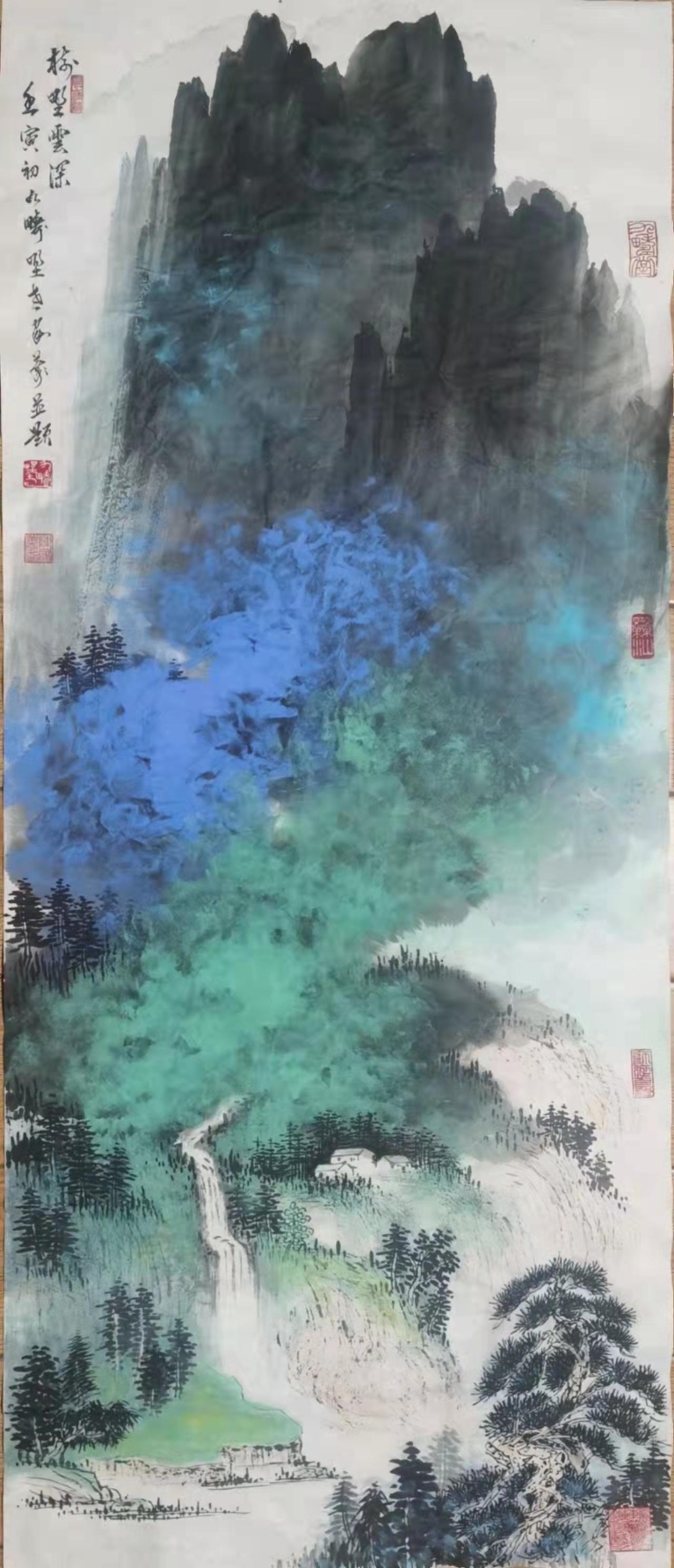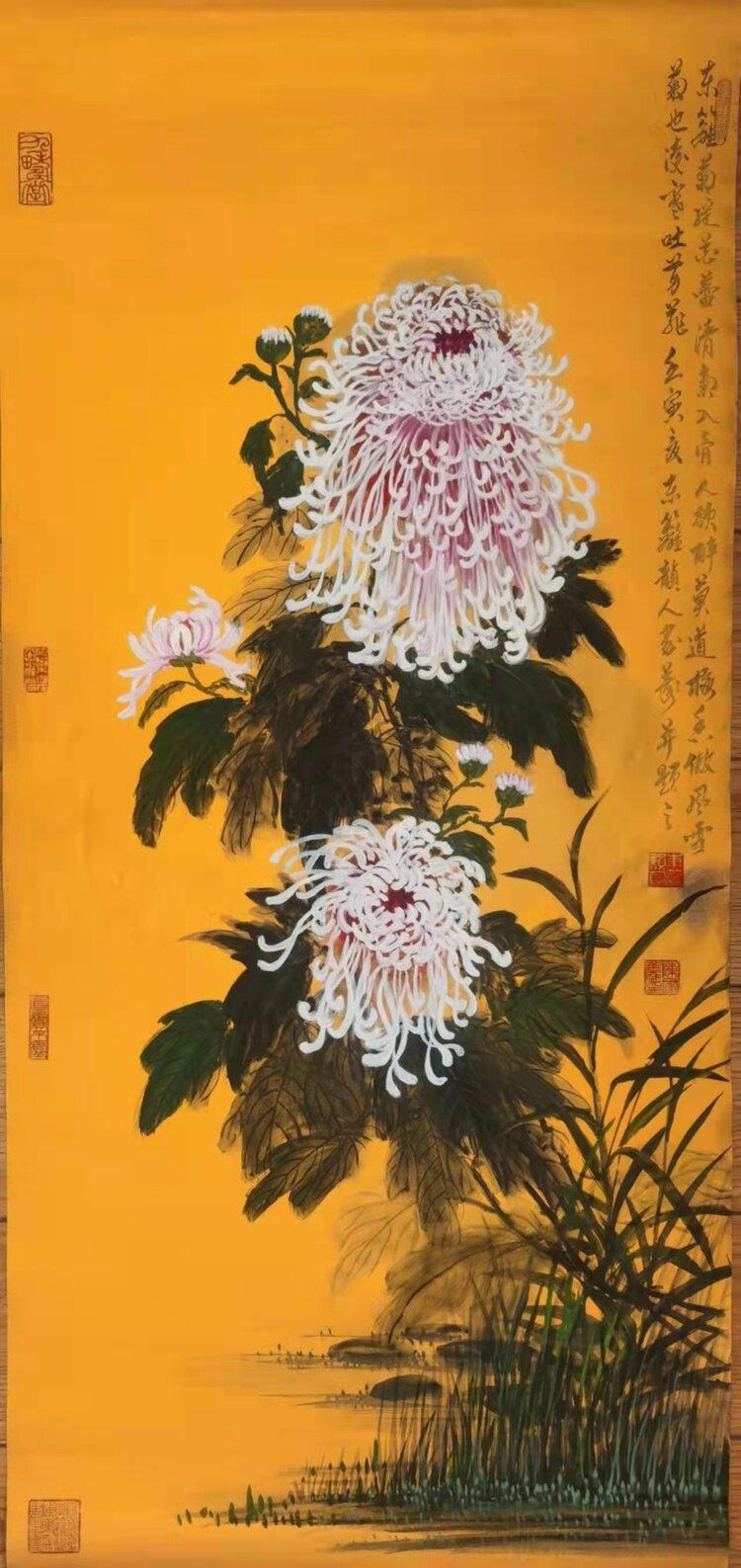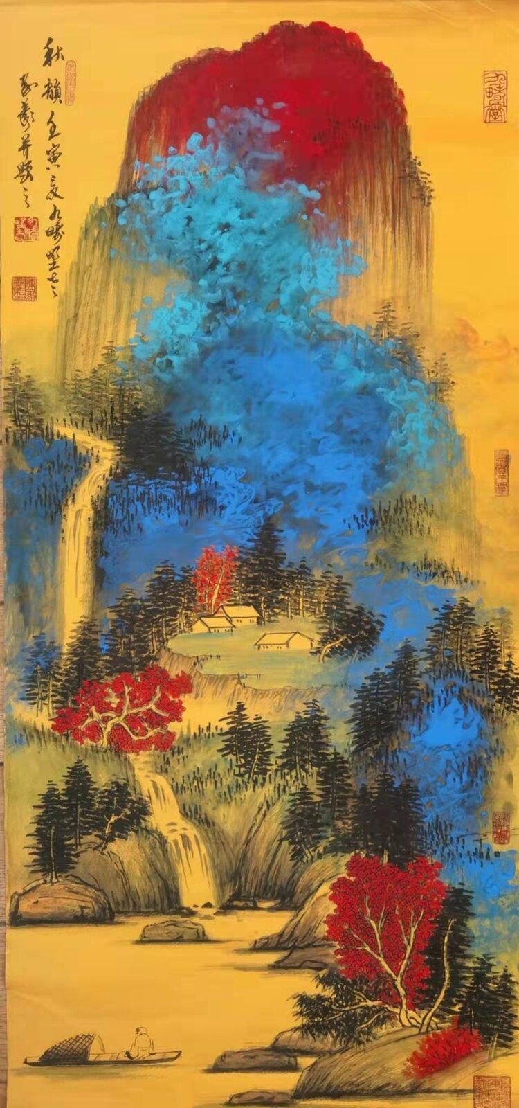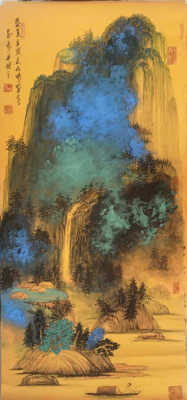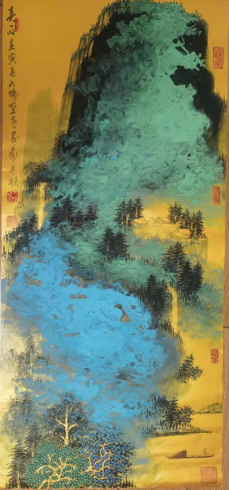 金箋畫是傳統(tǒng)繪畫的一種特有的形式,而彩墨作畫作為主要的方法和手段,其發(fā)展歷史久遠(yuǎn),金箋紙作畫給人以金碧輝煌、瑰麗富貴的形象,為人們所喜聞樂見。畫家在金箋紙上畫潑彩山水,更使之呈現(xiàn)出異樣的光彩。