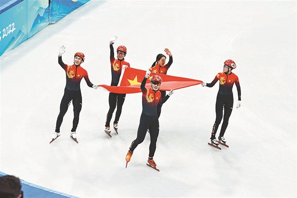 北京冬奧會(huì)短道速滑混合團(tuán)體接力中國(guó)隊(duì)摘金。