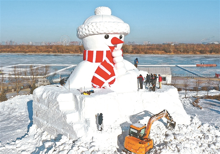 12月7日,哈爾濱市道里區(qū)群力江畔,一座巨型雪人已基本制做完成,工人在進(jìn)行收尾工作。雪人近20米高,黑眼睛,紅鼻子,戴著紅圍巾和白絨帽,手里拿著一大串糖葫蘆,笑容可掬,十分可愛(ài)。本報(bào)記者 蘇強(qiáng)攝