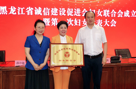 省直機關工委副書記、全省性社會組織黨委書記徐凱,省婦女聯(lián)合會黨組成員、省政府婦兒工委辦主任姜秀麗為黑龍江省誠信建設促進會婦女聯(lián)合會頒發(fā)牌匾。