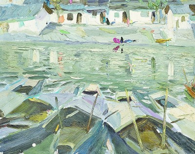 在諶北新的代表性作品里,無論何種結(jié)構(gòu),色調(diào)、筆觸、造型、線條都可以獨立觀賞。一塊厚堆的白色顏料,可以是云朵、是白墻,或是前后重疊的船帆。用筆的疏密、狀貌和節(jié)奏都有獨立存在的意義,既可以像欣賞書法用筆一樣拋開物象去體味,又可以去想象和填補(bǔ)與之恰合的物象和自然關(guān)系。諶北新對書法的深入研究和長期的繪畫寫生,以及他對物象、空間、色彩關(guān)系的觀察與創(chuàng)造實踐,使其作品能夠?qū)⒉煌谋憩F(xiàn)手法有機(jī)地融為一體。比如一筆畫下去,既表現(xiàn)空間層次,也體現(xiàn)厚薄輕重,同時展現(xiàn)光線的微妙變化。這種綜合性的呈現(xiàn)效果,實際上也契合著中國山水畫所追求的通過用筆的輕重緩急,通過虛實濃淡的墨色渲染,通過遠(yuǎn)近高低的畫面布局,表現(xiàn)山水對人的情感與心靈的影響。而諶北新的風(fēng)景油畫,正是基于中國人對山川草木的喜愛之情,通過體察和探求提煉出的獨特意象,它符合現(xiàn)代人的心理需求,也呼應(yīng)著畫家畢生追求的藝術(shù)境界——須其自來,不以力構(gòu)。