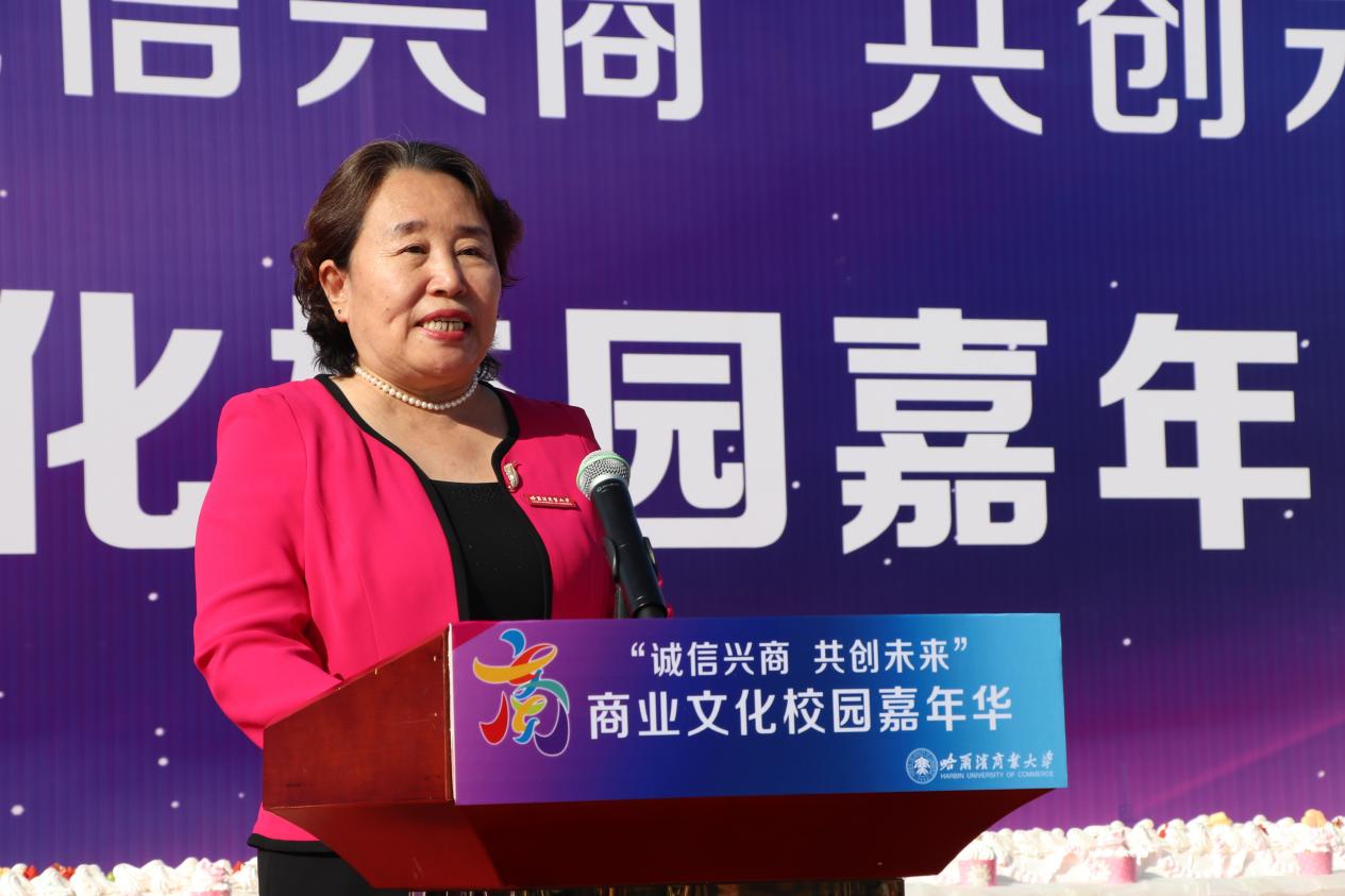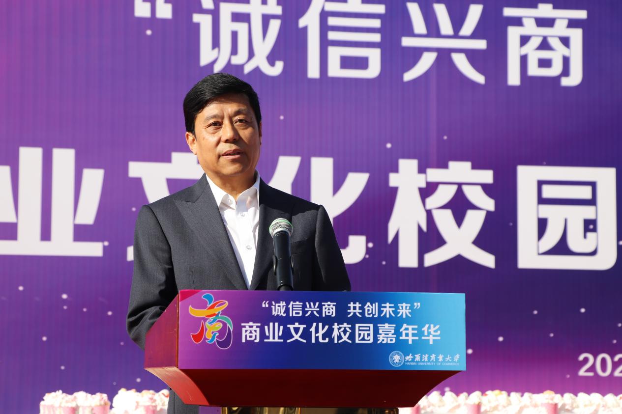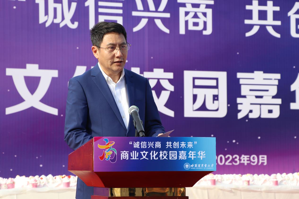 哈爾濱商業(yè)大學(xué)黨委書記孫先民致辭。他表示,誠信“軟實(shí)力”為高質(zhì)量發(fā)展提供“硬支撐”。本屆“誠信興商·共創(chuàng)未來”商業(yè)文化校園嘉年華活動堅(jiān)持以文化力量啟智潤心、固本培元,是深入學(xué)習(xí)貫徹習(xí)近平總書記在主持召開新時(shí)代推動?xùn)|北全面振興座談會和視察我省時(shí)的重要講話重要指示精神,全面落實(shí)立德樹人根本任務(wù)的務(wù)實(shí)舉措。哈爾濱商業(yè)大學(xué)作為新中國第一所多科性商業(yè)大學(xué),始終堅(jiān)持“大商鑄才、大雅育人、商雅兼?zhèn)?、?jīng)世濟(jì)民”的育人理念,厚植師生“心懷祖國,至誠奉獻(xiàn),以商弘業(yè),矢志一流”的大商之道?;顒訉⒊浞职l(fā)揮老字號在文化引領(lǐng)、品牌建設(shè)、產(chǎn)業(yè)升級等方面的示范引領(lǐng)作用,彰顯龍江市場主體活力與創(chuàng)新力,聚焦建設(shè)“六個(gè)龍江”、推進(jìn)“八個(gè)振興”,筑牢堅(jiān)定龍江文化繁榮發(fā)展的自信根基,進(jìn)一步凝聚師生扎根龍江、服務(wù)龍江、建設(shè)龍江的情懷和力量。
