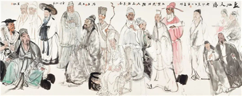 張江舟、紀(jì)連彬、孔紫、李曉柱、李乃宙、王輔民、盧志強(qiáng)、李連志、王瑛、張培生 長(zhǎng)江文脈 145cm×365cm 國(guó)畫