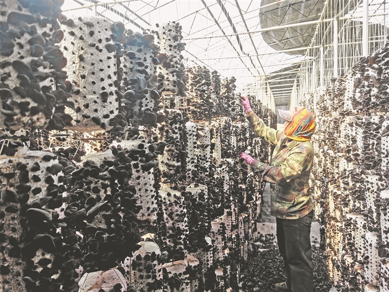 在各家的大棚內(nèi),采摘工分散在不同的角落,眼急手快地采摘著個頭足夠的黑木耳,手法嫻熟,儼然已是“老把式”。
