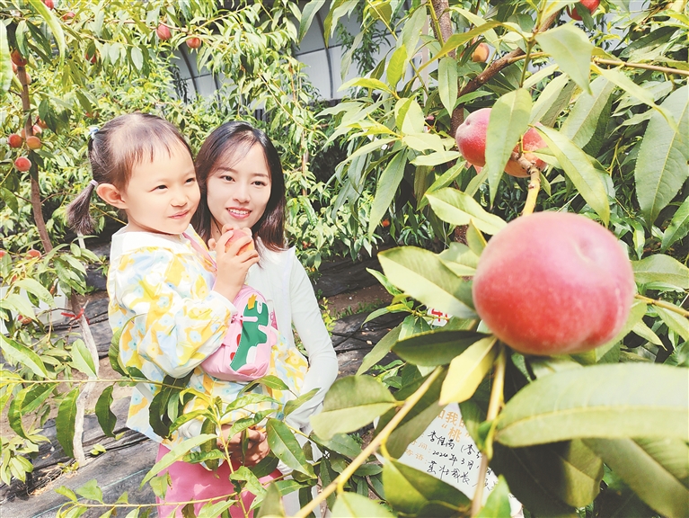 “我認(rèn)養(yǎng)了一棵桃樹,今天和妻子共同看看桃子的長勢,過些天就可以親自采摘了?!标P(guān)勇和妻子正在查看認(rèn)養(yǎng)的桃樹。