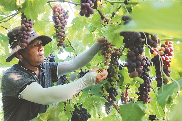“45、46、47……哇!一株葡萄樹竟然結(jié)出50串葡萄,真是大豐收!”7月2日上午8點,走進北大荒集團雙鴨山農(nóng)場有限公司翠博園“果蔬王國”的葡萄種植大棚,空氣中彌漫著清新的果香,一串串紫黑透亮的葡萄綴滿枝頭,圓潤飽滿,色澤鮮艷,格外喜人。