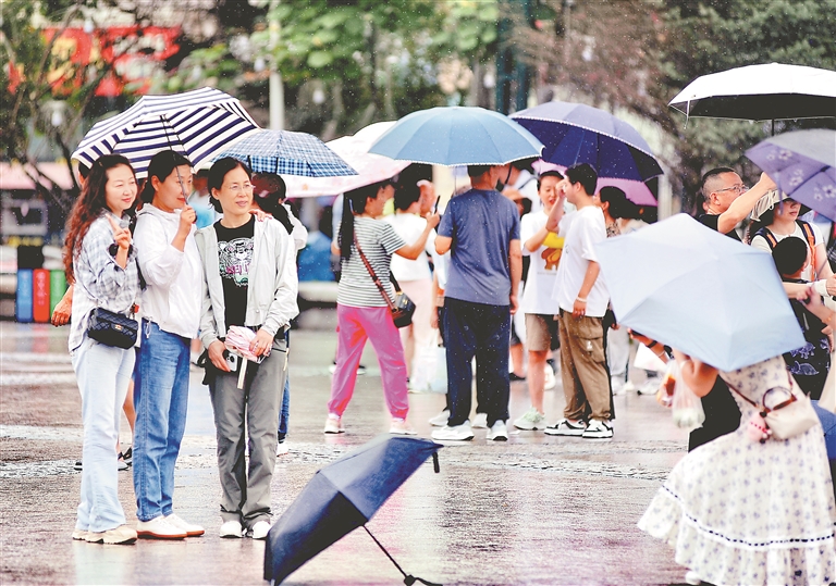 23日,哈爾濱市出現(xiàn)陣雨天氣。在索菲亞教堂、中央大街、江畔等地,游客們一邊觀賞美麗風景,一邊享受夏日清涼。