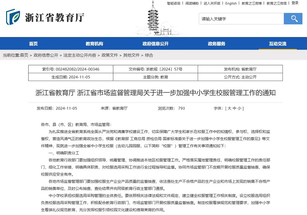 作為服裝產(chǎn)業(yè)發(fā)達(dá)省份,浙江省一直注重校服質(zhì)量。如2014年浙江省教育廳聯(lián)合浙江省質(zhì)量技術(shù)監(jiān)督局發(fā)布《關(guān)于進(jìn)一步加強(qiáng)學(xué)生服裝和床上用品管理工作的通知》;2018年,浙江省質(zhì)監(jiān)局聯(lián)合教育廳、工商局聯(lián)合發(fā)布了《浙江省學(xué)生服質(zhì)量提升行動(dòng)工作方案》;2022年10月,浙江省《教育收費(fèi)政策(2022年)》規(guī)定學(xué)校收取服務(wù)性收費(fèi)和代收費(fèi),堅(jiān)持學(xué)生自愿和非營利原則,不得與學(xué)費(fèi)、住宿費(fèi)合并統(tǒng)一收取,不得從中牟利。