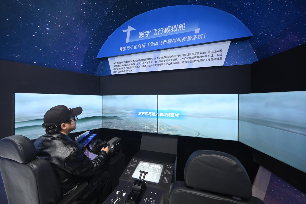 “只需要推動操縱桿,就能操作系統(tǒng),體驗(yàn)民航飛行員第一視角下、擬真的訓(xùn)練場景……”在展區(qū)前方,由南航自研虛像顯示技術(shù)和騰訊自研游戲引擎技術(shù)共同打造的全動飛行模擬機(jī)視景系統(tǒng),吸引眾多參觀者體驗(yàn)?;隍v訊自研游戲引擎,系統(tǒng)首次實(shí)現(xiàn)全局動態(tài)光照與地球級場景超寫實(shí)渲染,多邊形生成面數(shù)較之前提升380倍、貼圖精細(xì)度提升100倍,助力實(shí)現(xiàn)我國民航關(guān)鍵技術(shù)突破。