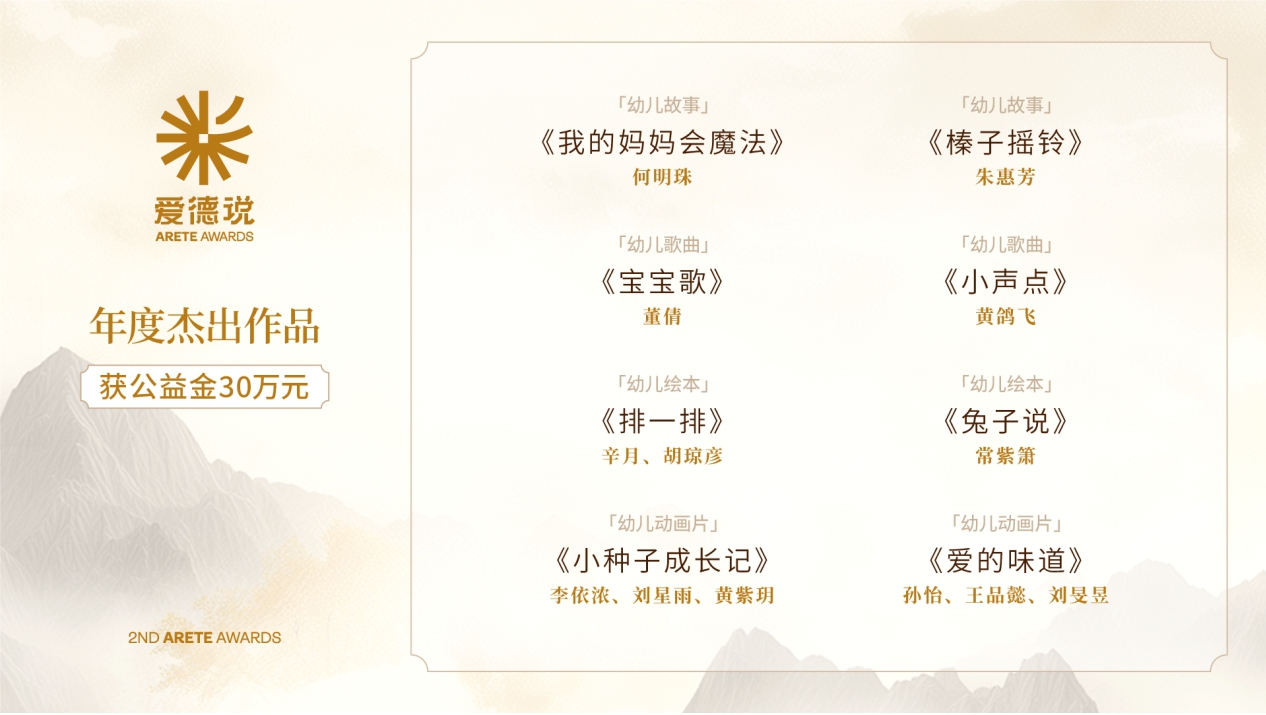 揭曉盛典上,幼兒故事《我的媽媽會魔法》《榛子搖鈴》,幼兒歌曲《寶寶歌》《小聲點》,幼兒繪本《排一排》《兔子說》及幼兒動畫片《小種子成長記》《愛的味道》8部作品獲評第二屆“愛德說”幼兒德育作品征集活動“年度杰出作品”,每部作品獲得主辦方提供的公益金人民幣30萬元。