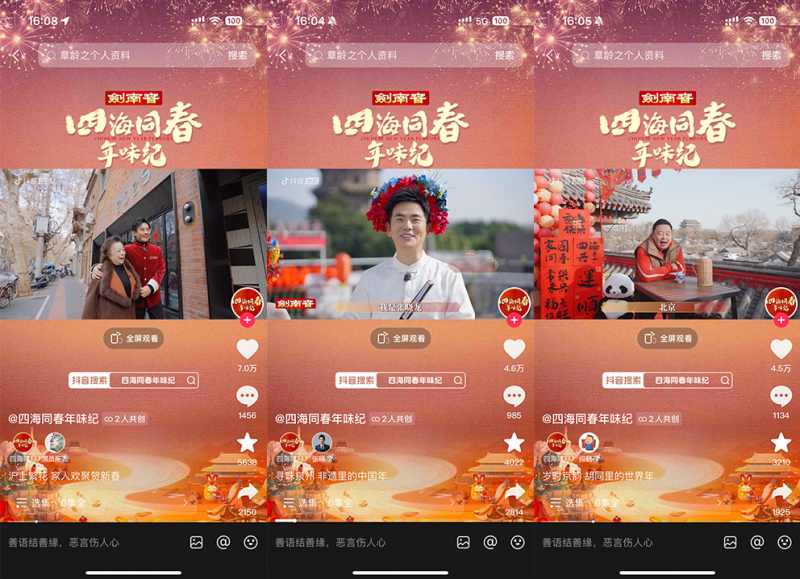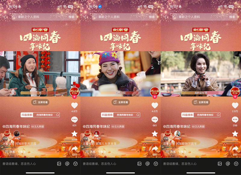 為紀念首個“非遺版春節(jié)”,由抖音出品、中國名酒劍南春冠名的春節(jié)主題紀錄片《四海同春年味紀》邀請多位明星來到家鄉(xiāng)或向往的城市,體驗當?shù)靥厣晡?。紀錄片于1月22日-1月27日,通過抖音、抖音精選、今日頭條、西瓜視頻、鮮時光等平臺播出。截至收官,該片正片播放量超1億,抖音話題播放量破2.3億,全網(wǎng)曝光達10億,相關(guān)話題多次登上平臺熱榜。