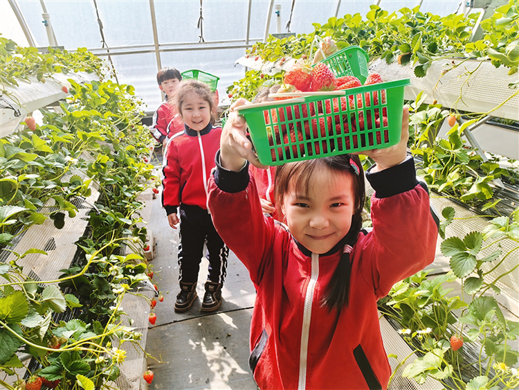 在位于陽明區(qū)樺林鎮(zhèn)的唐櫻園生態(tài)農(nóng)場里,整齊排列著24棟智能溫室大棚。在11號草莓大棚里,來自同心幼兒園的小朋友正在采摘草莓,孩子們興奮地圍著草莓觀察,“草莓真好看,草莓好甜??!”