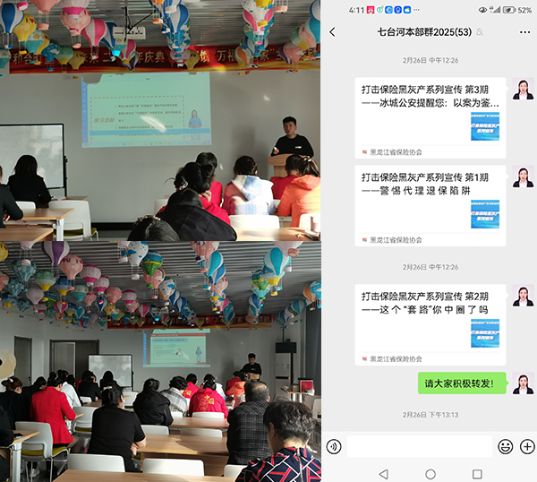 在此次打擊“代理退?!毙麄骰顒?dòng)中,七臺(tái)河中支利用微信工作群、微信朋友圈轉(zhuǎn)發(fā)宣傳內(nèi)容,詳細(xì)剖析了黑灰產(chǎn)的常見(jiàn)運(yùn)作模式,非法“代理退?!笨赡芙o消費(fèi)者帶來(lái)的四方面風(fēng)險(xiǎn):一是資金受損風(fēng)險(xiǎn);二是喪失正常保險(xiǎn)保障的風(fēng)險(xiǎn);三是個(gè)人信息泄漏風(fēng)險(xiǎn);四是相關(guān)行為可能導(dǎo)致消費(fèi)者面臨訴訟等法律風(fēng)險(xiǎn)。號(hào)召?gòu)V大群眾增強(qiáng)風(fēng)險(xiǎn)防范意識(shí),警惕非法“代理退?!碧茁?。