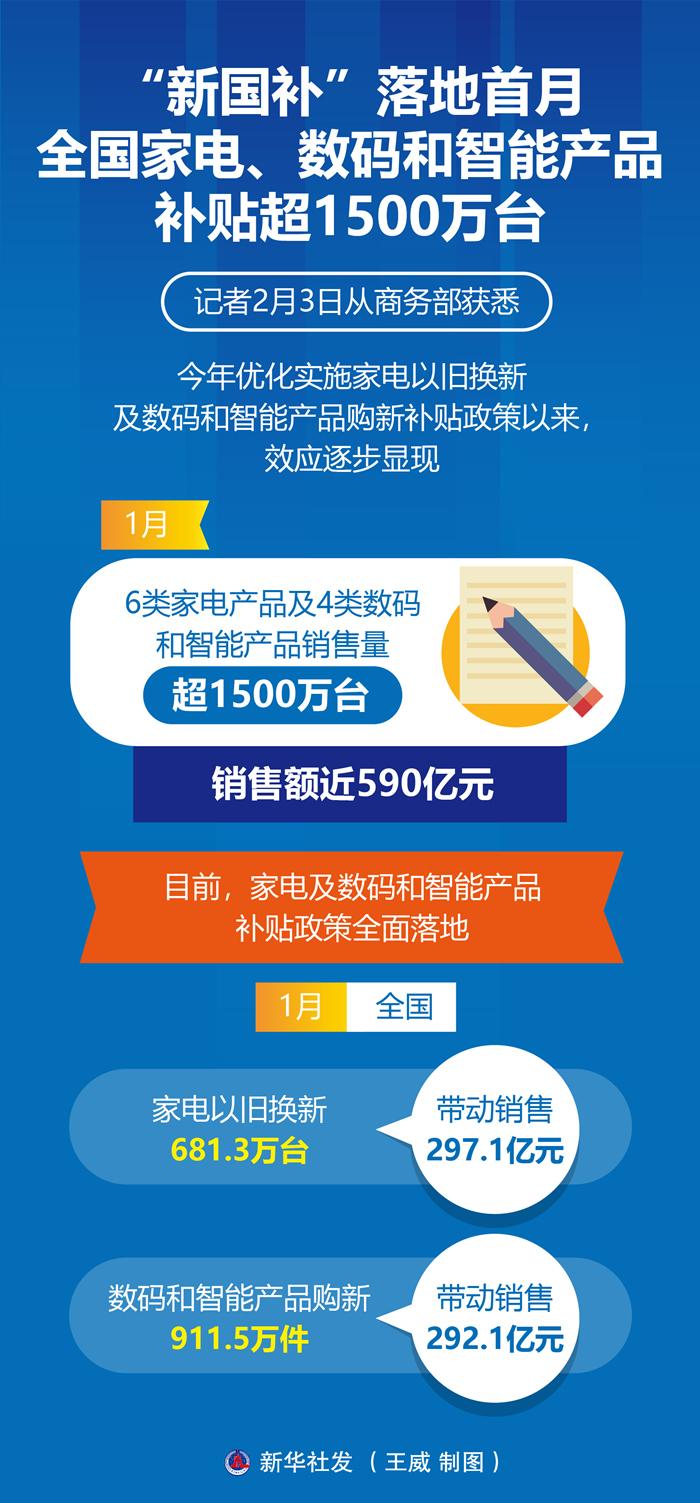 記者2月3日從商務(wù)部獲悉,今年優(yōu)化實施家電以舊換新及數(shù)碼和智能產(chǎn)品購新補貼政策以來,效應(yīng)逐步顯現(xiàn)。1月,6類家電產(chǎn)品及4類數(shù)碼和智能產(chǎn)品銷售量超1500萬臺,銷售額近590億元。