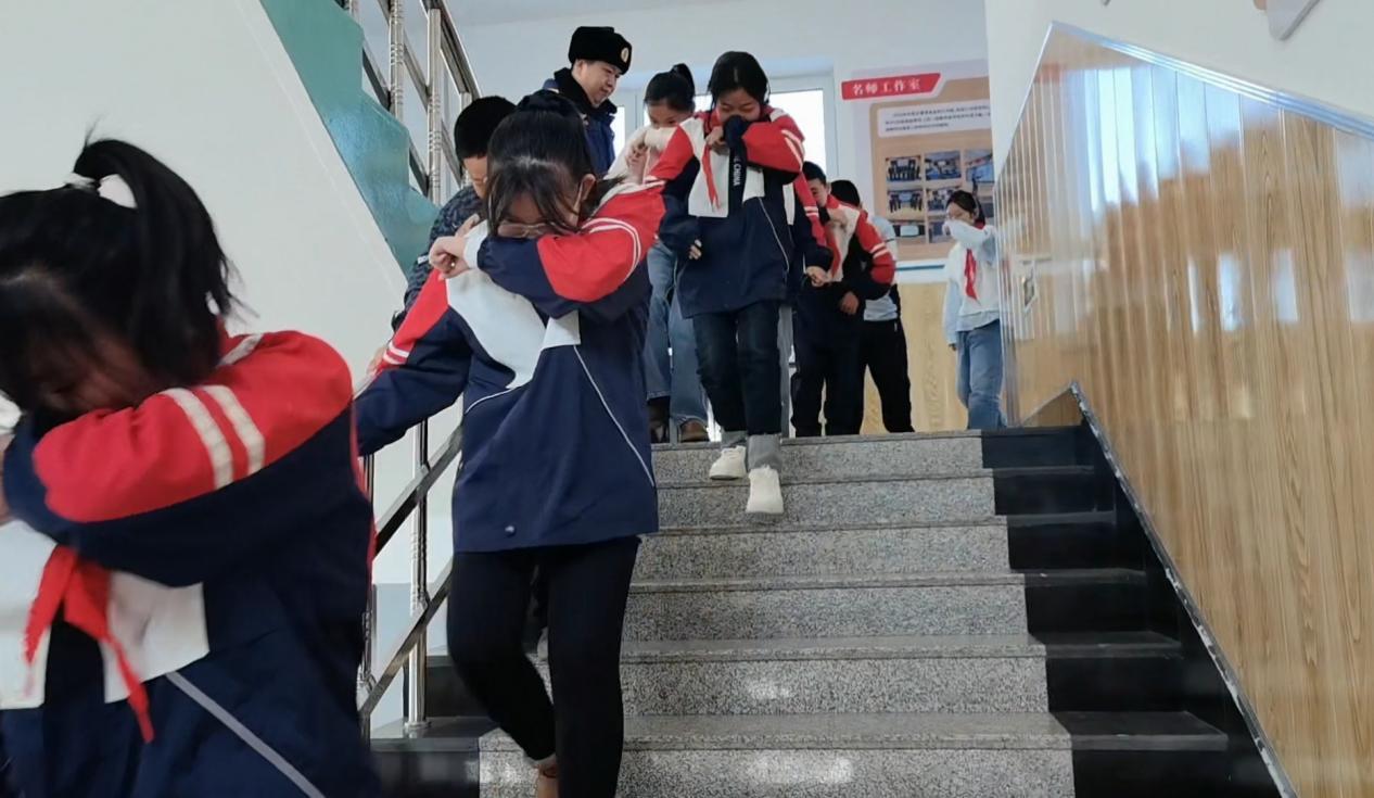 學(xué)生們在消防宣傳員與班主任的指引下有序開展應(yīng)急疏散演練(胡春磊 攝)